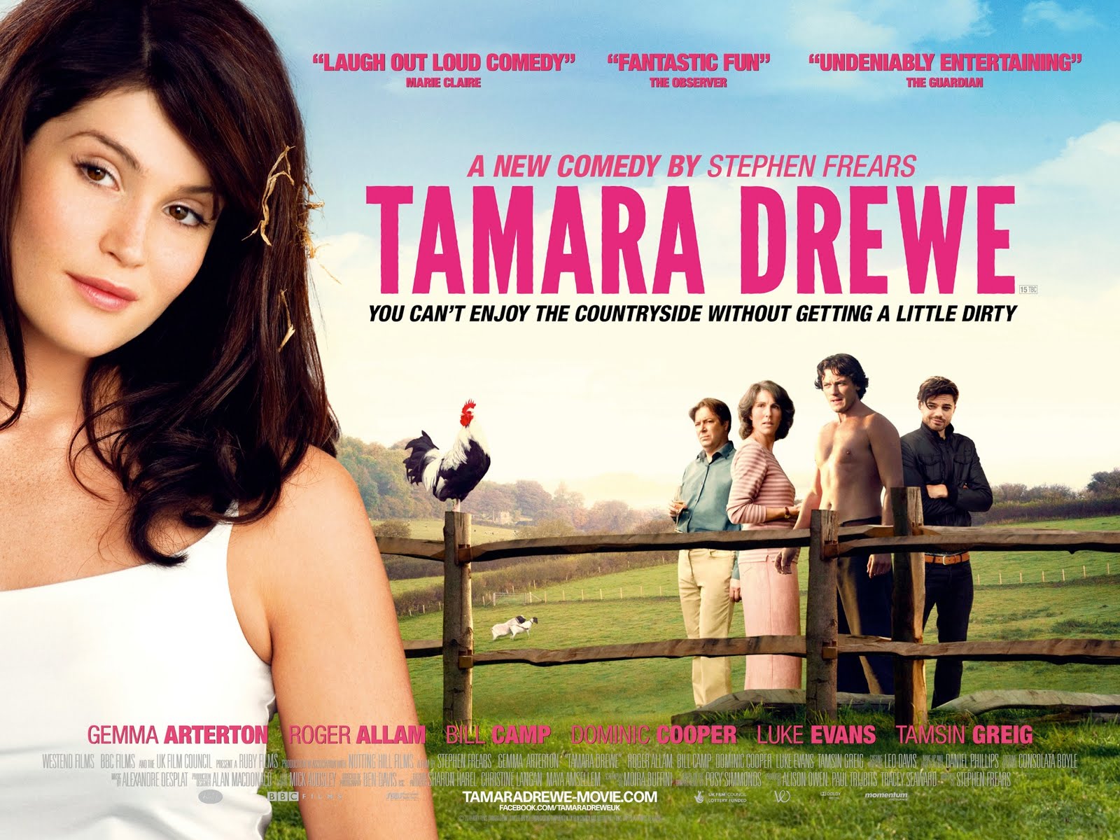 Dominic Cooper, on the other hand, can’t make his cartoony rock star seem anything like a real person, and unfortunately nor can Gemma Arterton in the title role.  Tamara Drewe is something of a blank; we really only see her through the (mostly lustful) eyes of others, and consequently don’t get to know her.  The script tells us bits about her history, but these glimpses never add up to a full person.  It might have helped if we got to hear more of her own writing – everyone in the film is presumably familiar with her column – but the film doesn’t share her inner voice with us.  Maybe this is deliberate – I seem to remember feeling the same way about her character in the book, which I haven’t read since its original serialisation in The Guardian – but if so, I’m not convinced everyone involved in the making of the film was aware of it.